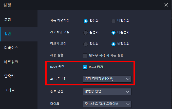 이후 LDPlayer 설정에서 Root 권한과 ADB 디버깅 - 원격 디버깅을 설정해준다.