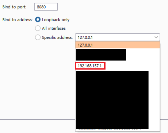 Burp Suite 프록시 주소 설정 부분에서 모바일 핫스팟을 켠 후, 기존에 없던 IP 주소가 생긴 것을 통해 확인할 수 있다.