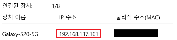 여기서 모바일 핫스팟의 IP 주소가 어떻게 되는지 잠깐의 의문이 들 수 있다.