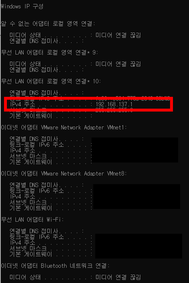 cmd 명령어를 통해 모바일 핫스팟을 새로 켰을 때 무선 LAN 어댑터 로컬 영역에 새로운 ip 주소가 생기는 것을 확인할 수 있다.
